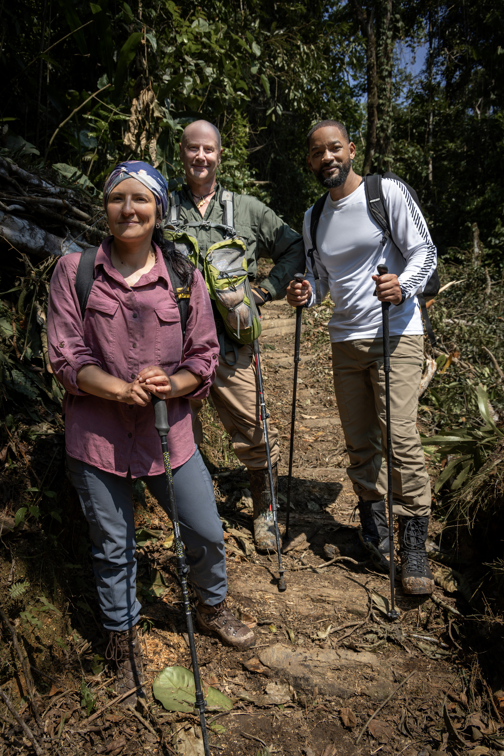 (From left to right): Expedition leader Carla Perez, Professor of Toxicology Bryan Fry and Will Smith as they trek through the Amazon searching for new species. (credit: National Geographic/