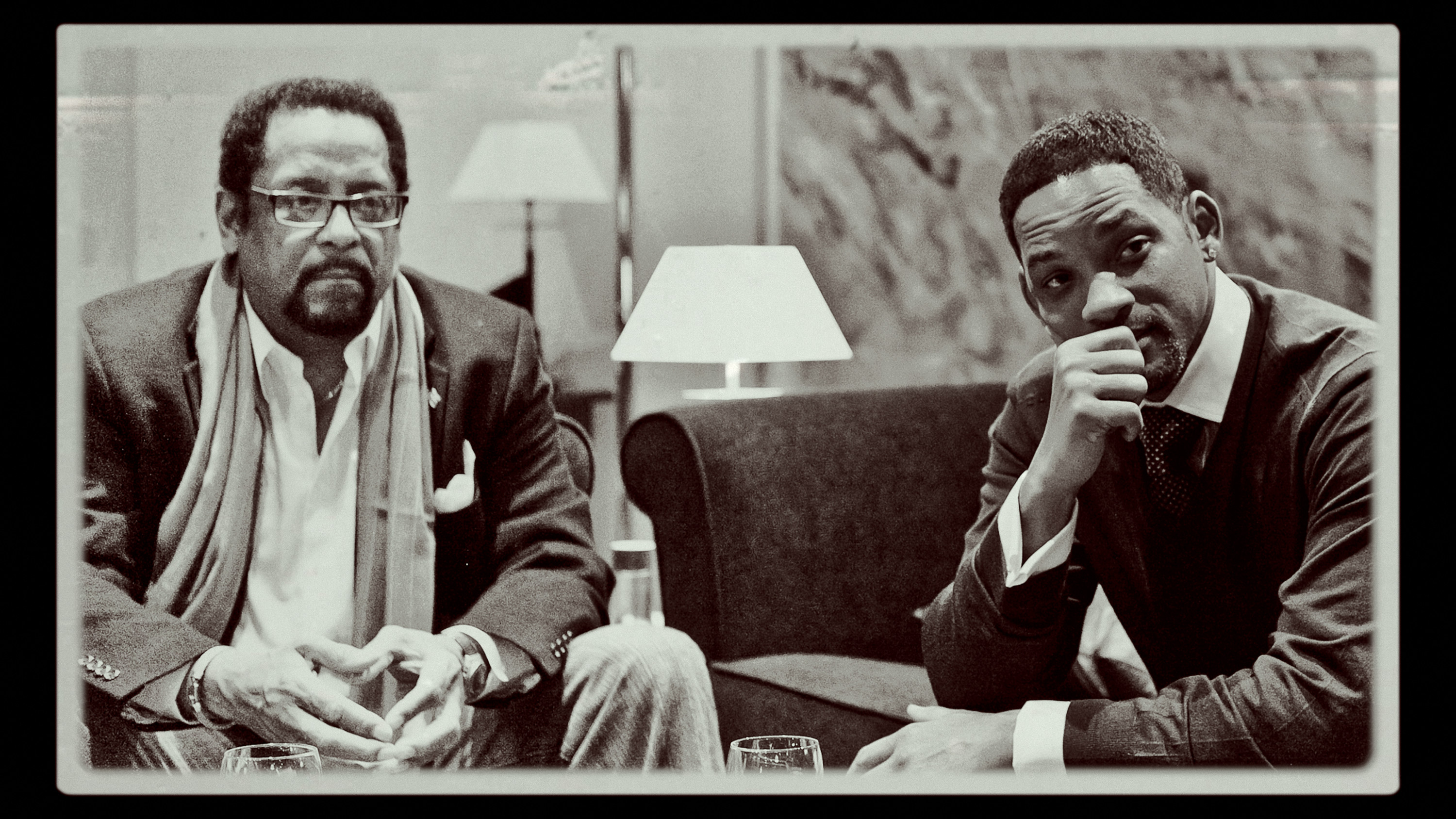San Bushman Guide Kane Motswana, left, and Will Smith sit and talk with the San people in the Kalahari Desert. (credit: National Geographic/Kyle Christy)Posted 12/10/25106_TheKalahariDesert_PoletoPoleWithWillSmith_20.jpg