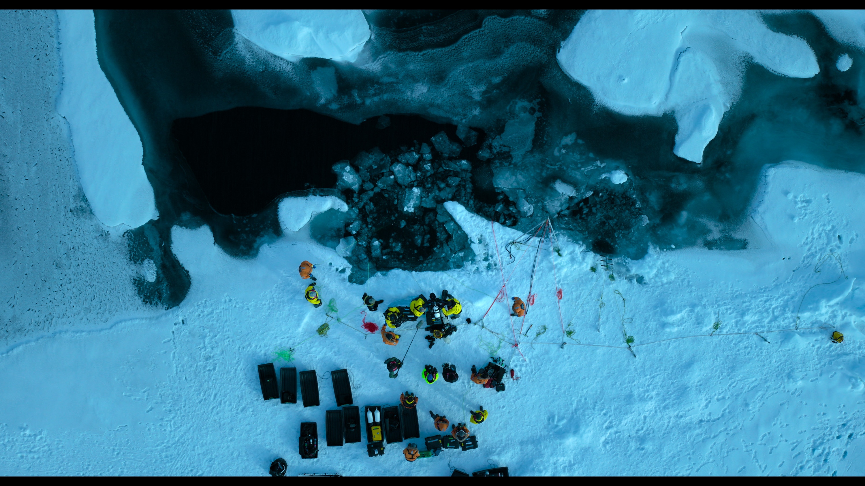 Aerial shot over looking the dive site on the ice during the North Pole shoot. (credit: National Geographic)Posted 12/10/25107_TheNorthPole_PoleToPoleWithWillSmith_UHD_02.jpg