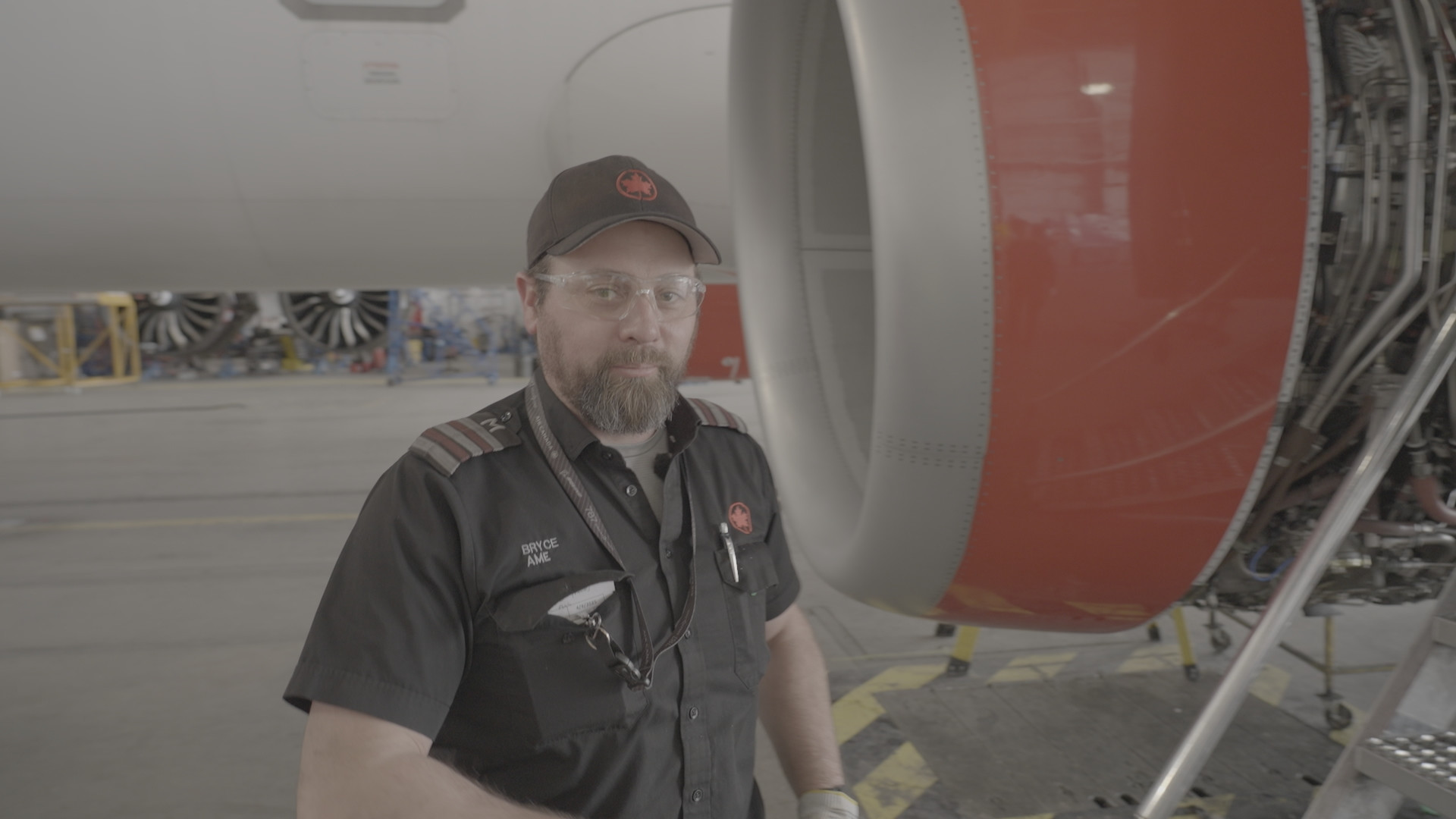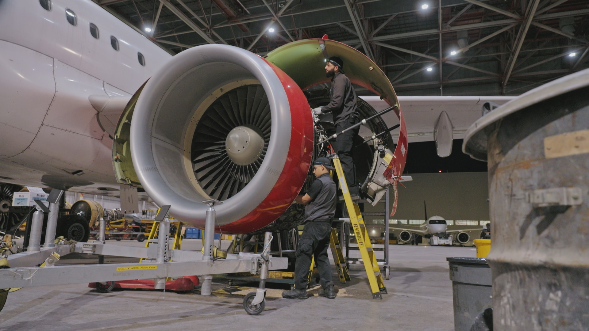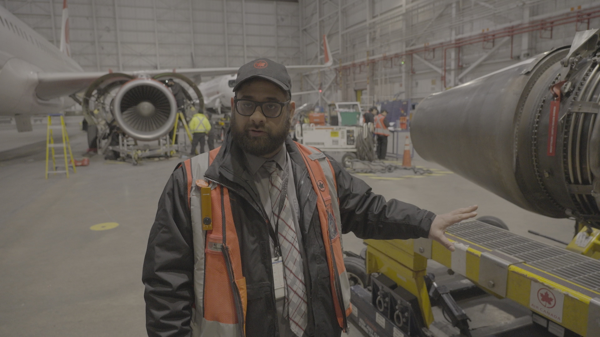 Inderjit Banwait, Aircraft Maintenance Engineer at Air Canada, and Irving Chevez, Lead Aircraft Maintenance Engineer at Air Canada, inspect one of the A320 engines. (Arrow International Media Ltd & Cantina Media)