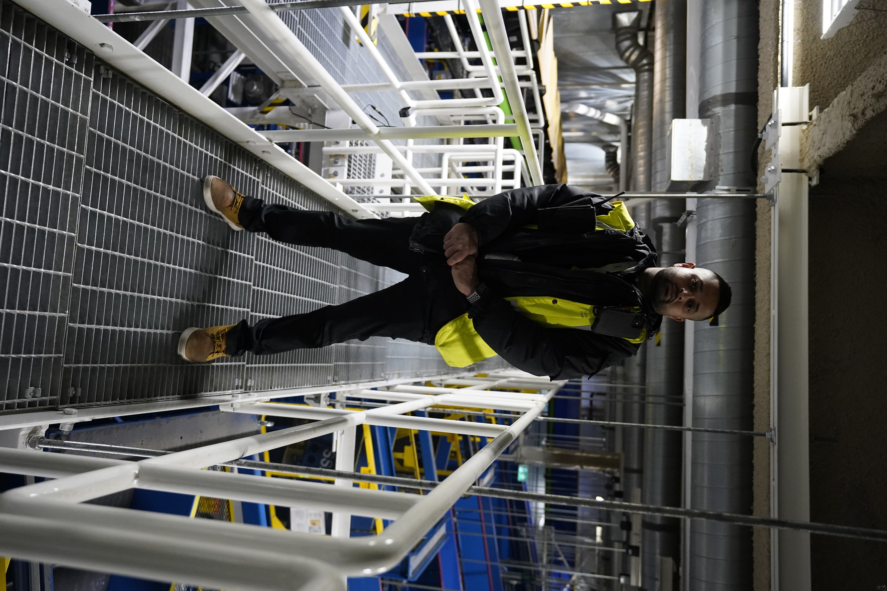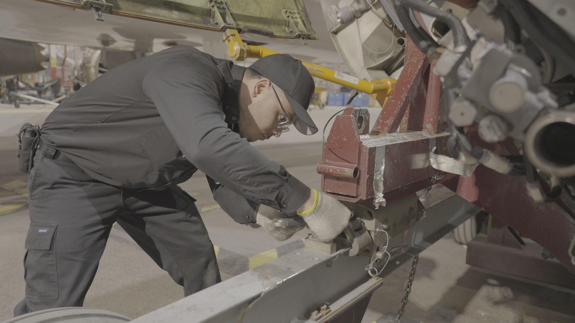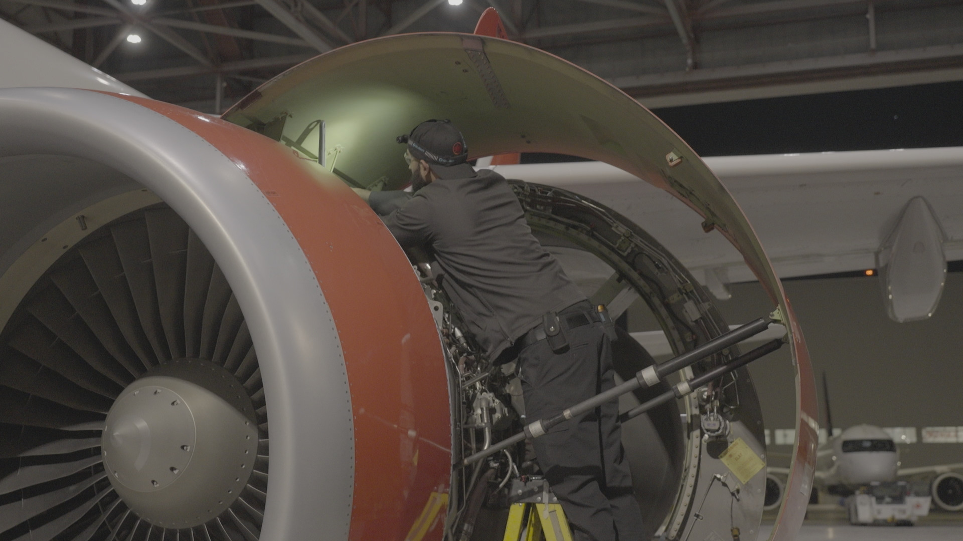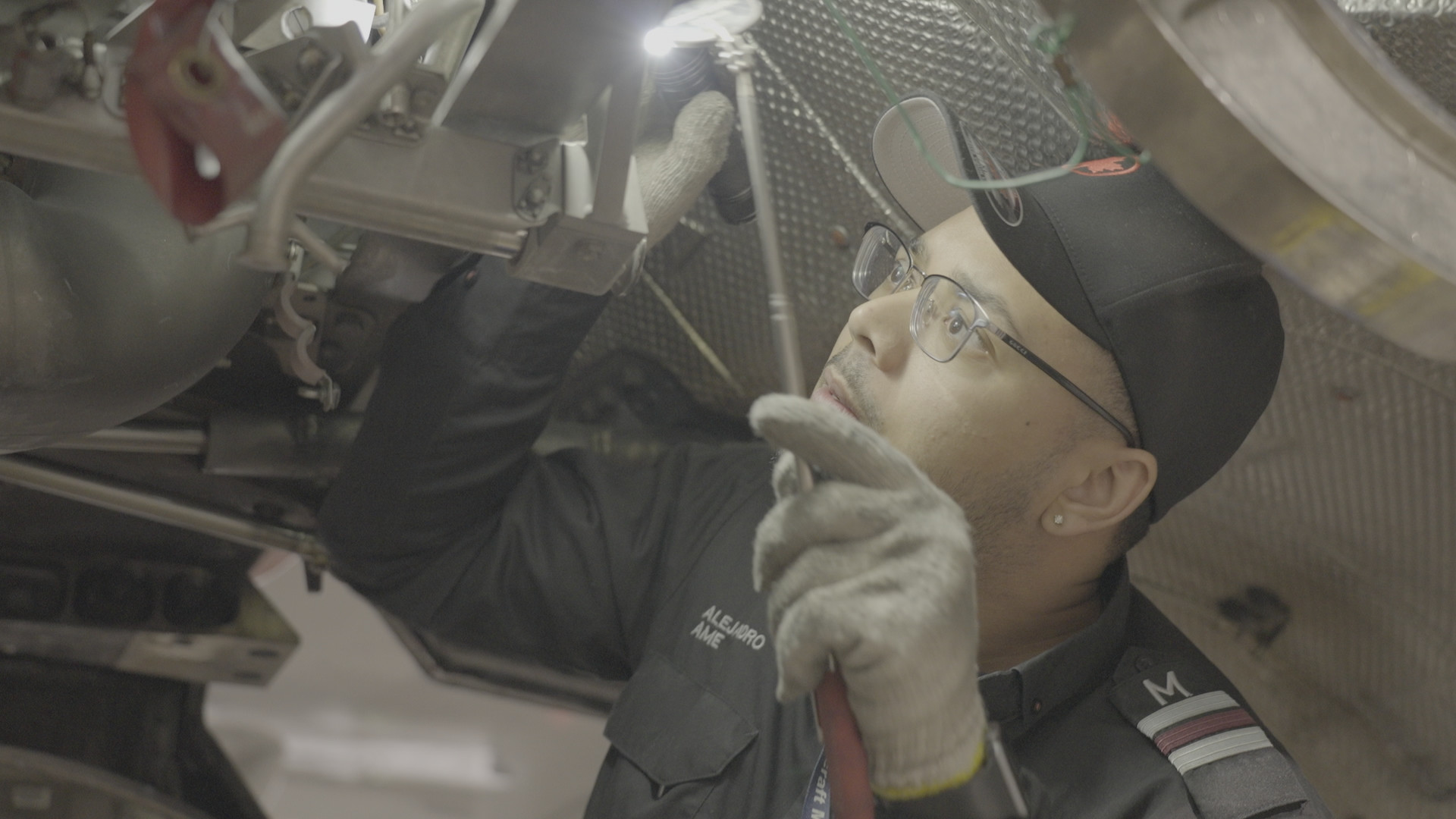Inderjit Banwait, Aircraft Maintenance Engineer at Air Canada, and Irving Chevez, Lead Aircraft Maintenance Engineer at Air Canada, inspect one of the A320 engines. (Arrow International Media Ltd & Cantina Media)